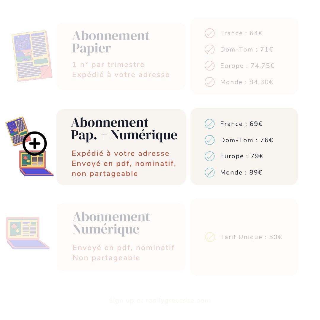 Abonnement 2026 – NVL la revue (Papier) 64,00 € – 84,30 €Plage de prix : 64,00 € à 84,30 € Pays Choisir une optionFranceEuropeDom-TomMondeEffacer quantité de Abonnement 2024 - NVL la revue Ajouter au panier Abonnements 2026 69,00 € – 89,00 €Plage de prix : 69,00 € à 89,00 € Pays Choisir une optionFranceEuropeDom-TomMondeEffacer quantité de Abonnement 2026 - NVL la revue (Papier) Ajouter au panier Abonnement 2026 – Numérique 50,00 € quantité de Abonnement 2024 - Numérique Ajouter au panier